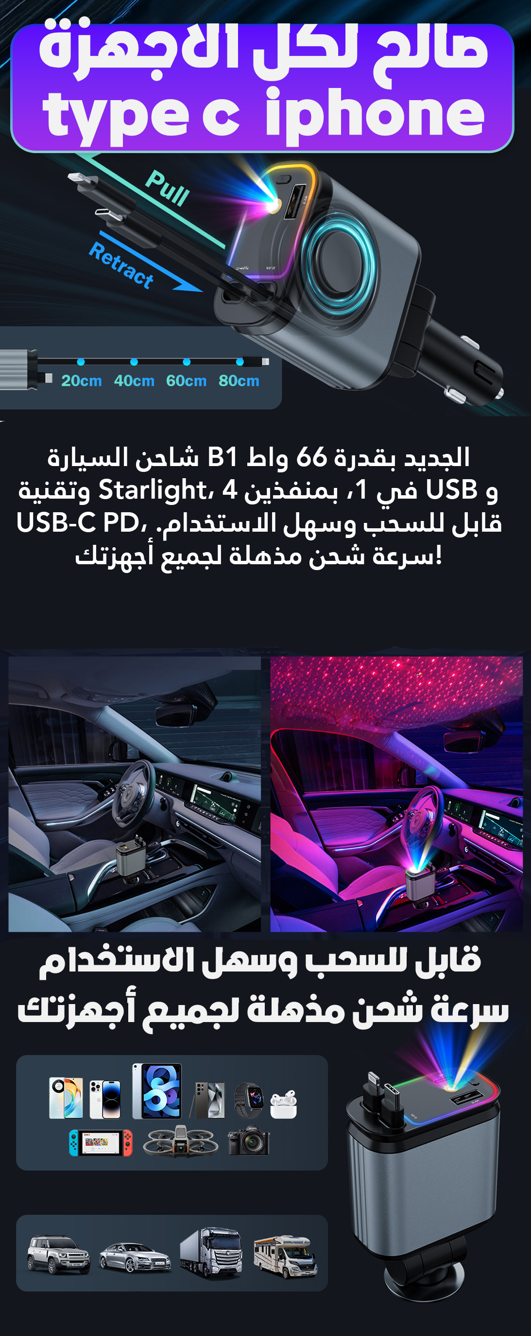 شاحن الهاتف 4 في 1 للسيارات مع ضوء النجوم